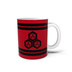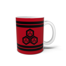 マグカップ 直江兼続家紋 三つ盛亀甲に三つ葉 赤地に黒縞