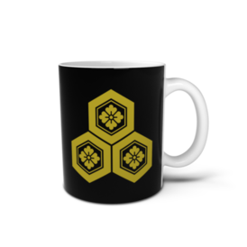 マグカップ 直江兼続家紋 三つ盛亀甲に花菱 黒地に金色