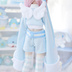 ♡パステルブルー×へそ出しジャージ×天使チャイナなお洋服です♡ ◆ジャージトップス◆ ジャージ生地とメッシュ生地を組み合わせて製作しましたトップスです。 おへそが出る短い丈です。背面には天使の羽が付いています。 チャイナ服をイメージしたデザインとして、スタンドカラーにチャイナボタンを飾り、袖丈を超ロングにしました。 開きはありませんので、ヘッドとハンドパーツを外した状態で上からかぶってご着用ください。 チャイナボタンは一応開閉出来ますがあくまでも飾りですので、閉じたままご着用下さい。 ◆ジャージショートパンツ◆ ふともも丈のショートパンツです。 ジャージ生地で制作し、サイドにラインテープを飾りました。 ウエストはゴムです。 ◆エプロン◆ 薄手のジャージ生地にキラキラ感のあるチュール生地を重ねて製作しました。 サイドのフリルは光沢のあるサテンです。 後ろのプラスナップで着脱してください。 ◆十字架ヘッドドレス◆ フリルレースとリボンを組み合わせて製作し、サイドにレジン製の大き目な十字架を飾り付けました。 裏側のクリップでウィッグに留め付けて下さい。 後頭部側から前に向かって留めると、正面からクリップが見えずにつけられます。 飾りやクリップは接着剤で取り付けておりますので、強く引っ張ると外れてしまいますのでご注意ください。 また、お洗濯にはご注意ください。 ◆オリジナルロゴ缶バッジ◆ 『飴』の文字を中華風にアレンジしたオリジナルロゴの缶バッジです。 ラメがたっぷり入った可愛いデザインです。 後ろのピンでお好みの場所へ留めつけて下さい。(お洋服に穴をあけたくない場合は同梱の磁石をお使いください。) ※ピン先は尖っておりますので怪我にご注意ください。 磁石、バッジともに小さなお子様のお手の届かないところへ保管してください。
