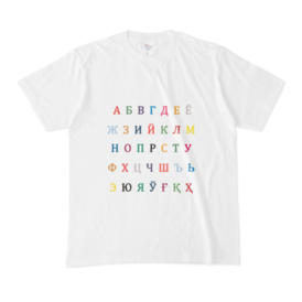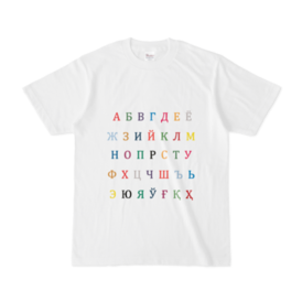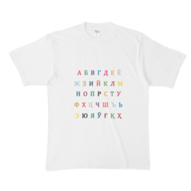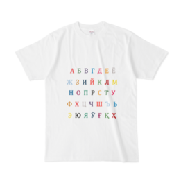 ウズベク語キリル文字アルファベットカラフル 半袖Tシャツ 白
