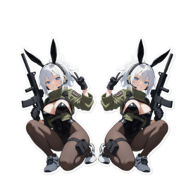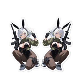 160 x 160 (mm)バニーガールx銃のイラストで、白抜きのステッカーになります。 反転したものを含めた2枚を1枚にしておりますので、必要に応じてハサミなどでカットしてください。 マガジンにカットして貼り付けているものは10mmx10mmの物を利用しています。 ・この商品はpixivFACTORYで作られた商品です。サンプル画像は完成イメージのため、実物と異なる場合があります。