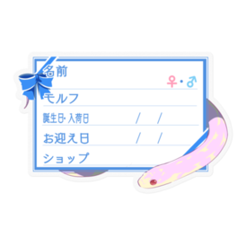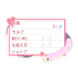 防水仕様のお名前ステッカーです🐍 マジックでご記入後、ケージなどに貼ってお使い下さい✨ ★文字を入れた状態での納品をご希望の場合、ご希望の商品名と、下記項目をわかる範囲でメッセージにてお伝えください🍀 ・お名前 ・性別 ・モルフ名 ・誕生日or入荷日 ・お迎え日 ・購入したショップ名 お名前ステッカー一覧 → https://blue-tetra.booth.pm/item_lists/mLdTYVqm DLデータ版 → https://blue-tetra.booth.pm/item_lists/myVTMMPV ≪フレームラインナップ≫ 1.ツタ 2.ツタ(英語) 3.お菓子 4.お菓子(英語) 5.ハート/ピンク 6.ハート/ピンク(英語) 7.ひまわり 8.ひまわり(英語) 9.もみじ 10.もみじ(英語) 11.リボン/ピンク 12.リボン/ピンク(英語) 13.星 14.星(英語) 15.ハート/ブルー 16.ハート/ブルー(英語) 17.リボン/ブルー 18.リボン/ブルー(英語) 19.雪 20.雪(英語) 21.夜 22.夜(英語) サイズは幅8.5cm前後です。 その他サイズ指定やホワイト(透明でないもの)、項目の変更、モルフの追加等ご希望ございましたら、メッセージ等でお気軽にご相談下さい(*'ω'*) この商品はpixivFACTORYで作られた商品です。サンプル画像は完成イメージのため、実物と異なる場合があります。
