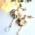 今まで作った蜂須賀は結構派手めなビジューを使ってきたので、久々に作った蜂須賀はナチュラルにしてみました。 いや派手だろという方、私もそう思います。 カッパーカルサイトの色味が画像では濃いですが、現物はもうちょっと薄くて柔らかい金です。髪色のビジューをあしらった花と、細かな所にも蜂須賀っぽいイメージを散りばめています。 下げている雫型カルセドニーは瞳の色イメージで。今見てたらメガネ留めが我慢ならないので、やり直す予定です。 ピアス・イヤリング両対応ですので、お好みの金具でご購入下さい。 ●アレルギー対応商品について 当店ではピアス、イヤリング、チェーン、アジャスター等にサージカルステンレス316を使用時明記しております。 体質には個人差がありますので、必ずしもアレルギーが出ないという保証ではございません。 樹脂ピアスも取り扱っておりますので、そちらもご検討下さい。 ●色褪せ・錆について ステンレス以外の、錆びやすい材質のパーツとの組み合わせの場合、そのパーツの錆びがステンレス表面に付着し「もらい錆」により錆びてしまうケースがございます。 その際は錆びをすぐに除去するようにしてください。 また、水に濡らしたりアルコール・汗等が付着しないようご注意下さい。 ●レジン作品について レジン作品は非常に繊細な為、強い衝撃を与えたり、高温・直射日光に長時間さらさないようご留意下さい。 また、水濡れやアルコール、汗などは劣化の原因となる為、触れないようにご注意下さい。 ●天然石について 当店では天然石を使用している場合、その種類を明記しております。天然石の一部は長時間の直射日光や水分に弱いものが多いです。アクセサリー用に加工されているものを仕入れておりますが、水に濡らしたり長時間直射日光にさらさないよう、ご注意下さい。