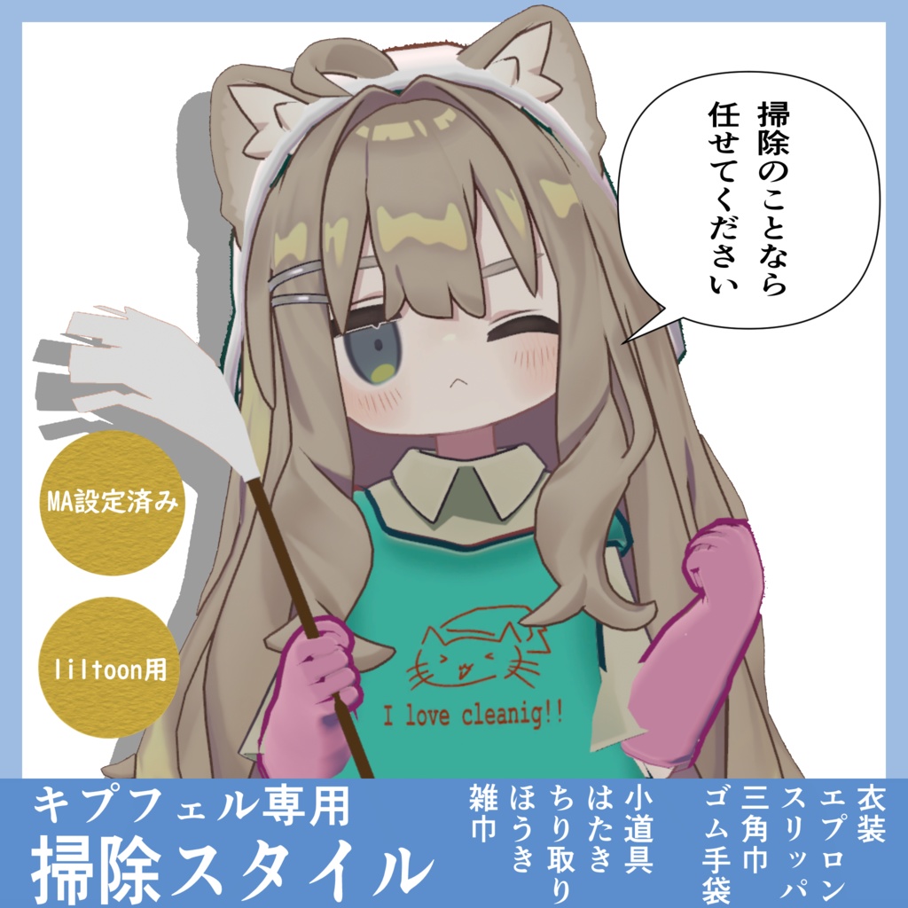 掃除のことなら任せてください──── プロとして──── キプフェル用です! 衣装の色変え簡単!! 小道具4種あり!! ほうきとはたきはphysbone入りで揺れる!! PERFECTなCLEANERになって、あらゆる場所で掃除しちゃおう!!!!!