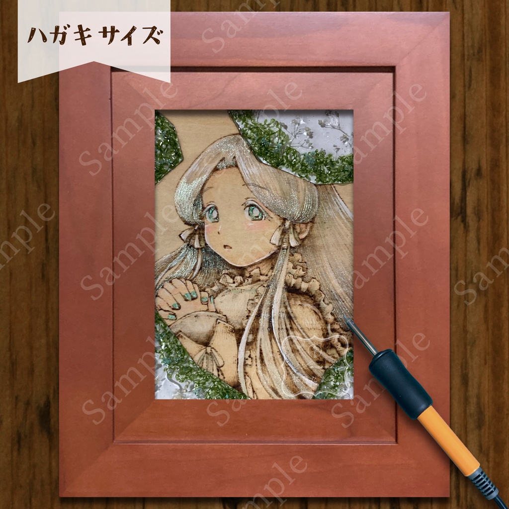 水辺に咲く素朴な植物と少女を描いたウッドレジン原画です。 ウッドバーニング(焼き絵)を施した板に、コピック、色鉛筆、顔彩で着色し、 板の切間にレジンを流して仕上げました。 完成後にフィニッシュ定着剤を噴霧しております。 少女の瞳や髪にはオーロラ系顔彩を、レジンの封入部分にはフェイクモスとドライフラワーを使用しておりますので、 角度を変えると上品な煌めきを感じていただけます。 木のナチュラルな質感が映える作品ですので お部屋のオブジェとしても飾りやすい原画です。 彼女が向ける素朴な眼差しを日常生活の中でお楽しみください。 サイズ:約ハガキサイズ(額付) 使用画材:ベニヤ板、レジン、レジンパーツ(フェイクモス、ドライフラワー)、電熱ペン、コピック、色鉛筆、顔彩 ◇撮影時の時間帯、ディスプレイや画面の明るさ等により実物とは若干色味などの印象が異なる場合がございます。ご了承ください。 ◇作品の販売は著作権を譲渡するものではございません。 ご購入後も作者自身がイラスト本やグッズを作る際にイラストを使用する可能性がございます。 【配送について】 あんしんBOOTHパックから、宅急便での匿名配送となります。 配達の日時指定はできませんので、ご了承ください。