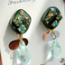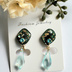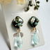 笹貫も新しいデザインが欲しいなーと思い、作ってみました。 ペリドットとターコイズのスワロフスキーをメインに、金箔と織部翠で和風を演出。 金フレークを散らした水色のドロップビーズで、水、海をイメージしました。 イヤリング金具はニッケルフリー、背面貼り付けになります。 ●アレルギー対応商品について 当店ではピアス、イヤリング、チェーン、アジャスター等にサージカルステンレス316を使用時明記しております。 体質には個人差がありますので、必ずしもアレルギーが出ないという保証ではございません。 樹脂ピアスも取り扱っておりますので、そちらもご検討下さい。 ●色褪せ・錆について ステンレス以外の、錆びやすい材質のパーツとの組み合わせの場合、そのパーツの錆びがステンレス表面に付着し「もらい錆」により錆びてしまうケースがございます。 その際は錆びをすぐに除去するようにしてください。 また、水に濡らしたりアルコール・汗等が付着しないようご注意下さい。 ●レジン作品について レジン作品は非常に繊細な為、強い衝撃を与えたり、高温・直射日光に長時間さらさないようご留意下さい。 また、水濡れやアルコール、汗などは劣化の原因となる為、触れないようにご注意下さい。 ●天然石について 当店では天然石を使用している場合、その種類を明記しております。天然石の一部は長時間の直射日光や水分に弱いものが多いです。アクセサリー用に加工されているものを仕入れておりますが、水に濡らしたり長時間直射日光にさらさないよう、ご注意下さい。