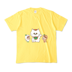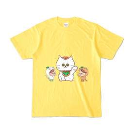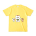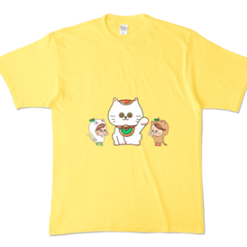 カラーTシャツ - XL - イエロー (濃色)ぱりぃグミ!!のグミの妖精、青りん&紅りんと招き猫のご利益のありそうなTシャツだよ。良い事が沢山舞い込んで来ますように♪ この商品はpixivFACTORYで作られた商品です。サンプル画像は完成イメージのため、実物と異なる場合があります。