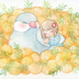 ふかふかなミモザともふもふの文鳥に包まれながら、幸せそうに寝転ぶ少女を描きました。