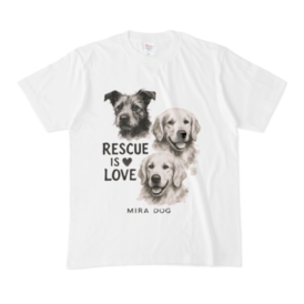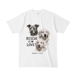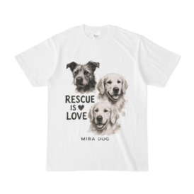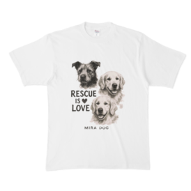 前にも後ろにも「Rescue is Love」。 雑種犬と2頭のゴールデンレトリバーを墨絵風に描いた MIRA DOGオリジナルアートが胸元に。 背面にはメッセージを大きくプリント。 ── 保護犬と生きる優しさを伝える、想いのこもったTシャツです。 🖨 前面&背面プリント(両面印刷) 🧵 綿100%/ホワイトTシャツ 📏 サイズ:S / M / L / XL(ユニセックス) 売上の一部は、保護犬の医療費や生活費に活用されます。