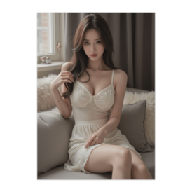 この商品はpixivFACTORYで作られた商品です。サンプル画像は完成イメージのため、実物と異なる場合があります。 ソファに座るエレガントな美女。ホワイトベビードールが清楚で可憐な魅力を引き立てる、上品なポスター作品です。