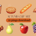 秋の美味しい食べ物や可愛いモチーフを、やわらかい色鉛筆タッチで描いたクリップアート素材です。
