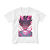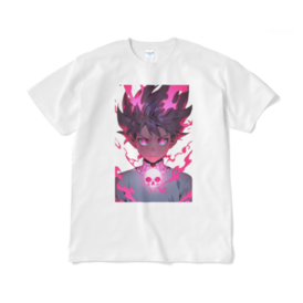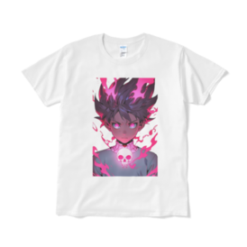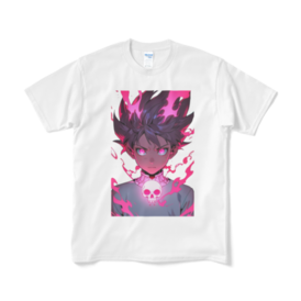 は、鮮やかなピンクの炎に囲まれた力強い少年を描いたアニメ風デザインのTシャツです。胸には印象的なスカルエンブレムが光り、瞳も輝いています。大胆なピンクのアクセントが目を引き、エッジの効いたストリートファッションとアニメの美学を融合。柔らかい白いTシャツにプリントされており、ユニークで情熱的なデザインが好きなアニメファンにぴったりです。