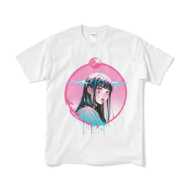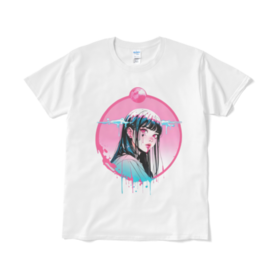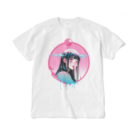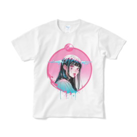 幻想的なピンクの月を背景に、涙を流す少女を描いたアートTシャツ。 デジタルアートとストリートファッションの融合を感じさせる一枚で、印象的なビジュアルが目を引きます。