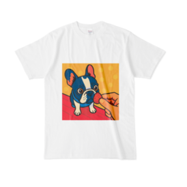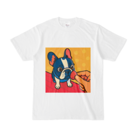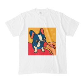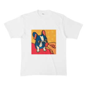 フレンチブルドッグが、真っ赤なイチゴにくぎづけ! 好奇心いっぱいのまなざしを、ポップな色彩でTシャツに閉じ込めました。 着るだけで、ちょっとした物語が始まるかも。