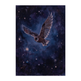 この商品はpixivFACTORYで作られた商品です。サンプル画像は完成イメージのため、実物と異なる場合があります。 無数の星が輝く夜空を舞うフクロウを描いた幻想的な油彩風ポスター。宇宙を背景に広がる翼は、自由と神秘の象徴のように見えます。ロマンチックな雰囲気のお部屋におすすめ。