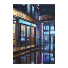 この商品はpixivFACTORYで作られた商品です。サンプル画像は完成イメージのため、実物と異なる場合があります。 雨上がりのコンビニ前に灯る光。ガラス越しのネオン反射が、どこか懐かしく温かな夜の情景を映し出します。