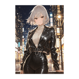 この商品はpixivFACTORYで作られた商品です。サンプル画像は完成イメージのため、実物と異なる場合があります。 夜の街に佇む、自信と静けさを纏う女性。 黒のレザージャケットが街灯の光を受け、強さと優雅さを映し出す。 凛とした美しさが漂う、アーバンスタイルのポスター作品です。