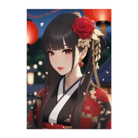 この商品はpixivFACTORYで作られた商品です。サンプル画像は完成イメージのため、実物と異なる場合があります。 夜祭の灯りの下、紅い薔薇を髪に飾った女性が微笑む姿。金と赤の華やかな着物が、幻想的な光の中で優雅に映えます。和のロマンを感じるポスターです。