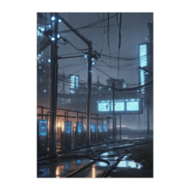 この商品はpixivFACTORYで作られた商品です。サンプル画像は完成イメージのため、実物と異なる場合があります。 雨に濡れる電線と光のラインが織りなす都市の回路。濡れたアスファルトに映る青と橙の光が、未来都市の息遣いを感じさせます。