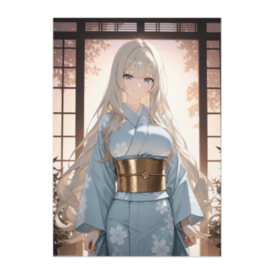 この商品はpixivFACTORYで作られた商品です。サンプル画像は完成イメージのため、実物と異なる場合があります。 夕暮れの柔らかな光に包まれた女性。淡い青の着物と金の帯が調和し、静かな和の気配を感じさせる一枚です。上品で穏やかな美しさを、部屋のインテリアとしても楽しめます。