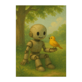 この商品はpixivFACTORYで作られた商品です。サンプル画像は完成イメージのため、実物と異なる場合があります。 やわらかな森の中で、小さなロボットが初めて出会ったのは、一羽の小鳥でした。 ぎこちない手のひらに、そっと止まる黄色い鳥。 無言のまま、ふたりのあいだに小さな絆が生まれていく――。 優しさと温もりを感じる、無声童話のようなポスターアートです。