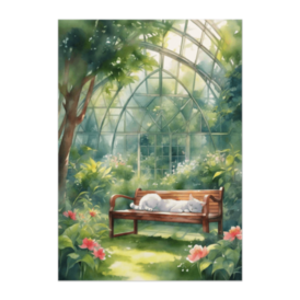 この商品はpixivFACTORYで作られた商品です。サンプル画像は完成イメージのため、実物と異なる場合があります。 森の中のガラス温室。やわらかな光と緑に包まれて、白猫がベンチでお昼寝。透明感のある水彩タッチが魅力の作品。