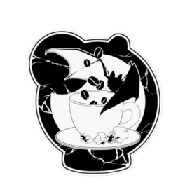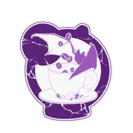 ぽぽのイメージロゴステッカーが出来ました。 コウモリとコーヒーとポップコーンが入ったロゴを使ったステッカーです! 色は3色でイメージカラーの紫は勿論、黒と白もご用意しました!是非お好きな所に貼ってください!