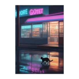 この商品はpixivFACTORYで作られた商品です。サンプル画像は完成イメージのため、実物と異なる場合があります。 雨上がりのネオン街に映る灯りの中、黒猫が静かに歩く。 鮮やかな光と静寂の対比が美しい、現代アニメ風景ポスター。
