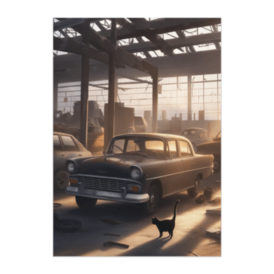 この商品はpixivFACTORYで作られた商品です。サンプル画像は完成イメージのため、実物と異なる場合があります。 夕陽の差し込む廃車工場。 錆びた車の間を歩く黒猫が、時の流れの静けさを語る。 過ぎ去った日々へのオマージュとなるアニメ風景ポスター。