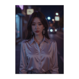 この商品はpixivFACTORYで作られた商品です。サンプル画像は完成イメージのため、実物と異なる場合があります。 紫の光がきらめくネオンシティの夜。 サテンブラウスと大ぶりのイヤリングが輝く、 1980年代の華やかさを感じさせるグラマラスなポスターです。