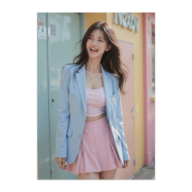 この商品はpixivFACTORYで作られた商品です。サンプル画像は完成イメージのため、実物と異なる場合があります。 パステルブルーとピンクのコントラストがまぶしい、 80年代風ストリートファッションの女の子。 軽やかな笑顔と風を感じる一枚です。