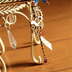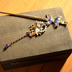 透き通る羽を持つ蝶と歯車を廻す猫。不思議な夢の中の様な情景をあらわしたかんざしです。 透ける蝶の羽にはホロフィルムを散らして、光の当たる角度でキラキラと羽ばたく幻のように表情を変えます。 そんな蝶の下には歯車の上を駆ける猫と、歯車の螺子の変わりにクリアカラーとアメジストカラーのスワロフスキーが施され煌きとアクセントを加えます。 雫型のアメジストはまるで零れ落ちた不思議な夢の名残がゆらゆらと揺れて、蝶と歯車猫を追いかけているかのようです。 和装にも洋装にも髪を彩るアクセントとして如何でしょうか?