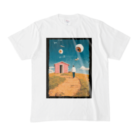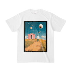 Tシャツ - XL - 白【English】 Where are you heading? Who is watching? Another iconic scene from our Dreamcore/Weirdcore video series on Instagram & TikTok is now available as a T-shirt. A lone figure walks up a dry, hilly path towards a strange pink house. The sky above is filled with giant, floating eyes, tracking his every move. A surreal landscape that evokes both nostalgia and a strong sense of unease under constant surveillance. Is that house a safe haven, or something else entirely? Wear this bizarre, dreamlike "somewhere" as your personal piece of art. 【日本語】 どこへ向かっているのか。 誰に見られているのか。 Instagram/TikTokで公開中のDreamcore/Weirdcore動画シリーズから、新たなワンシーンがTシャツになりました。 乾いた丘の道を、ピンク色の奇妙な家へ向かって歩く一人の男。 彼が見上げる空には、いくつもの巨大な目が浮かび、その歩みを見つめています。 ノスタルジックな風景と、強烈な監視下の不安。 あの家は、安全な避難所(セーフハウス)なのか、それとも…。 夢の中の「どこか」を描いた、シュールな風景。 この奇妙な世界を、あなたのアートピースとして身にまとってください。