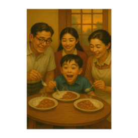 ポスター - B2この商品はpixivFACTORYで作られた商品です。サンプル画像は完成イメージのため、実物と異なる場合があります。 昭和の家族団らんを描いた温かい油絵風イラスト。食卓に湯気の立つカレーライス、笑顔の家族の姿が懐かしさを呼び起こします。