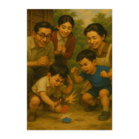 ポスター - B2この商品はpixivFACTORYで作られた商品です。サンプル画像は完成イメージのため、実物と異なる場合があります。 地面にしゃがみ、真剣にめんこを叩きつける少年たち。その熱気を笑顔で見守る家族。懐かしい昭和の遊びと情景を油絵風で再現しました。