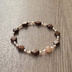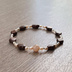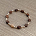 Inner circumference: 15 cm Material: beads, vintage wooden beads, freshwater pearl beads, natural stone beads, stretch cord Color: milky peach, soft peach pink, walnut brown, mahogany brown, silver pink やわらかな光を放つ5mmのオレンジムーンストーンを一粒添え、手もとに静かな温かみをもたらすブレスレットです。 フランスでロザリオのために作られたヴィンテージのウッドビーズを使用し、深みのあるブラウンが落ち着いた印象を与えます。 淡いソフトピーチピンクの淡水パールとシルバーピンクビーズを組み合わせ、木の温もりの中にやさしい光を感じるデザインに仕上げました。 穏やかで上品な雰囲気をまとった一点です。 ブレスレットは透明ゴムを使用しており、内周15cm になっています。 【About Orange Moonstone】 オレンジムーンストーンは古代から珍重され、さまざまな文化で特別視されてきました。古代ギリシャでは月の女神セレネと結びつけられ、その輝きは月の魔法を宿すと信じられていました。また、女性の守護石としても用いられ、妊娠や出産を始めとした女性のライフリズムに寄り添う石とされてきました。 この石は、創造力や直感力、感情のバランスを高めるとされます。やわらかな輝きは穏やかさと温かさをもたらし、月のリズムに合わせた体内の調和をサポートすると考えられています。 【condition】 ヴィンテージビーズには、小さな傷や汚れが見られる場合がございます。あらかじめご了承ください。 *撮影時には可能な限り実際の色味を再現するよう努めておりますが、完璧ではない場合がございますことをご了承ください。 *返品はお受けできません。 *納品書、領収書は発行いたしません。