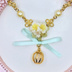 ご覧いただきましてありがとうございます。 樹脂粘土製のパーツ、ホワイトジェイド、パールビーズ、かごチャーム、リボンを使用したネックレスです。 かごチャームの中に4mmのホワイトジェイドが2個入っています。 ネックレストップが大きめなので、首元を華やかに飾ってくれますよ! 大きめに結んだリボンがポイントです。 このネックレスのデザインはこれまでに出展してきたイベントでも好評でした♡ サフィックス社のスウェットバリアを使用しての金属アレルギー対応も可能です。 ご希望の方は右のメニューより「金属アレルギー対策有」の項目を選んでください。 ※注意※ ☆お花のパーツは樹脂粘土でできています。性質上強い力や水濡れに弱いので、やさしいお取り扱いをお願い致します。 ☆定形外郵便でのお届けのみとなります。 【Size】 チェーン:45~50cm(アジャスター:5cm) ・パールビーズ:6mm ・コネクター:8mm ネックレストップ: ・ブーケ:約1.6cm×1.7cm ・ホワイトジェイド:4mm ・かごチャーム:1.1cm×1.1cm