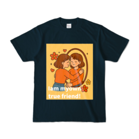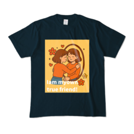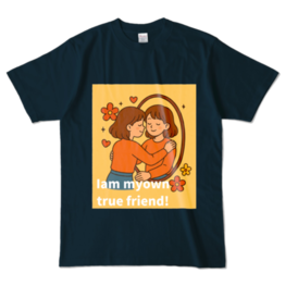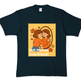 カラーTシャツ - XL - ネイビー (濃色)この商品はpixivFACTORYで作られた商品です。サンプル画像は完成イメージのため、実物と異なる場合があります。鏡の中の自分に、そっと「大丈夫だよ」と伝えたくなる日。 このTシャツは、そんなあなたの心に寄り添う一枚です。 「真の友は自分だよ!」 自分を抱きしめるイラストとともに、 この言葉が、あなたの内側にあるやさしさと強さを思い出させてくれます。 背景には、あたたかな黄色と花々、ハートやきらめきが散りばめられ、 まるで心の中の春が広がっていくようなデザインに。 落ち込んだときも、誰かに頼れないときも、 このTシャツがそっと教えてくれるんです。 あなたは、あなたの一番の味方だよ」って。 自分を大切にしたいすべての人へ。 やさしさを着る、そんな感覚をぜひ味わってみてください。