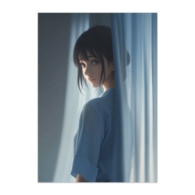 ポスター - B2この商品はpixivFACTORYで作られた商品です。サンプル画像は完成イメージのため、実物と異なる場合があります。 青いカーテンの隙間から差し込む光。 柔らかな表情の女性が、静かに心を見つめる一枚。 透明感と穏やかな静謐を感じさせます。