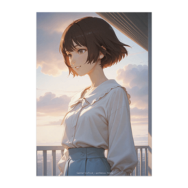 ポスター - B2この商品はpixivFACTORYで作られた商品です。サンプル画像は完成イメージのため、実物と異なる場合があります。 雨上がりのバルコニーで、そっと微笑む少女。夕日の光が頬を包み、日常の中に静かな希望が差し込む瞬間を描きました。やさしい色合いと柔らかな光が心を癒すアートポスターです。