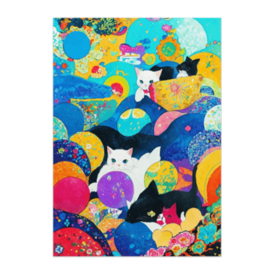 ポスター - B2この商品はpixivFACTORYで作られた商品です。サンプル画像は完成イメージのため、実物と異なる場合があります。 風船のような丸い形と鮮やかな配色で、猫たちが自由に遊ぶ世界を表現。ブルーとイエローの対比が美しく、見ているだけで心が弾むデザインです。