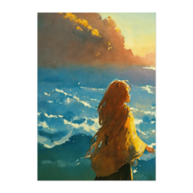 ポスター - B2この商品はpixivFACTORYで作られた商品です。サンプル画像は完成イメージのため、実物と異なる場合があります。 海辺で風を感じる女性を描いた水彩油絵風ポスター。黄金色の光と青の海が溶け合うような筆致が印象的で、自由と希望を感じさせます。透明感あふれるタッチが、見る者の心に爽やかな風を吹き込みます。