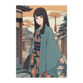 ポスター - B2この商品はpixivFACTORYで作られた商品です。サンプル画像は完成イメージのため、実物と異なる場合があります。 Neo-Ukiyo Elegance シリーズより。 静かな古都の町並みを歩く女性を描いた一枚。 浮世絵の線とアニメの光が溶け合い、穏やかな朝の空気を感じさせます。