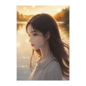 ポスター - B2この商品はpixivFACTORYで作られた商品です。サンプル画像は完成イメージのため、実物と異なる場合があります。 夕陽に染まる湖面と、その光を受けて美しく輝く少女の横顔。静かな水辺の空気と柔らかな風の気配が感じられる一枚。セミリアルな淡いタッチで描かれた、儚くも温かな情景アートです。