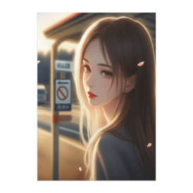 ポスター - B2この商品はpixivFACTORYで作られた商品です。サンプル画像は完成イメージのため、実物と異なる場合があります。 夕日を浴びて優しく振り返る少女を描いたセミリアル系アニメポスター。バス停の静かな空気と、舞い落ちる桜の花びらがノスタルジックな世界観を高めています。ふんわりとした光の描写が、お部屋に温かい雰囲気を届けます。