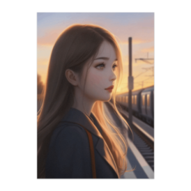 ポスター - B2この商品はpixivFACTORYで作られた商品です。サンプル画像は完成イメージのため、実物と異なる場合があります。 静かな駅のホームで夕日を受ける少女を描いたセミリアル系アニメポスター。髪を照らす柔らかな逆光、遠くの列車、金色の空気感が切ないほど美しい時間を表現しています。大人っぽく飾れる上品な一枚です。