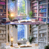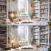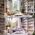 魔法の書斎をテーマに画像を作りました。 こちらは白を基調とした書斎イメージです。 構図は6枚とも同じで、色味や要素が違っています。 こちらはAI生成した画像です。6枚セットでzipでダウンロードできます。
