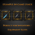 インベントリアイコン 装備画面のスロット用画像 戦利品(Loot)アイコン 合成・鍛冶UIの素材 スキルアイコンの一部として ローグライク風のランダムアイテム生成用 ゲーム内のUIデザイン全般