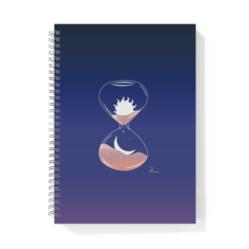 リングノート - B5 - 片面太陽が輝く昼間の世界から月の見守る夜の世界へ。 美しく壮大な宇宙の砂時計を、1冊のノートにしました。 ◆ 商品スペック ・サイズ:150mm×180mm ・用紙:アートポスト(表紙・裏表紙)、上質紙(本文) ・ページ数:80P(40枚) ・リングカラー:シルバー ・印刷:表紙フルカラー、本文無地 ・書きやすく持ち運びにも絶妙なサイズ感 ◆ 制作の裏側 静かに過ぎていく時間。 でも、確かに動いてる時間。 その感覚を、月と太陽(陰と陽)と一緒に、 ひとつの空間にまとめてみたい、と思って作りました。 砂時計の中に、地球と宇宙の広さを詰め込むような気持ちで、 砂は砂漠や地平線のイメージを重ねています。 小さな器の中に、途方もない景色を。 そんな発想で生まれた作品です。 ------------------------------------------------------------ ※お使いのディスプレイによって色味が異なる場合があります。 ※プレビュー画像は元の作品よりも色味が暗く見えることがあります。 実際の仕上がりは、掲載の原画画像も併せてご確認ください。