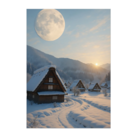 【ポスター】Moon and Morning over a Snow Village – 雪の里に残る月と朝日 –